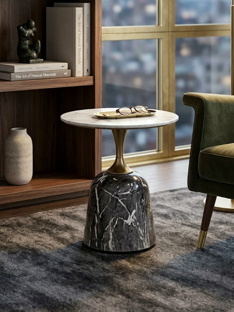 The contrast between stone and metal creates a refined visual balance. The Pandora Accent Table is both a functional surface and an artistic element within the room.