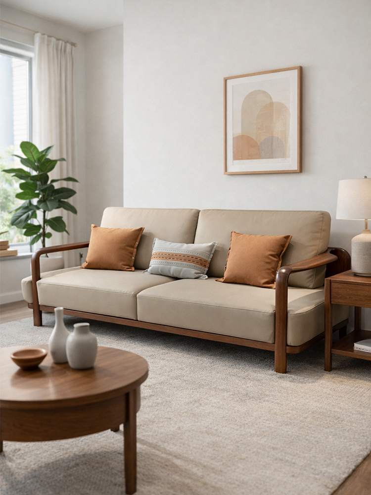 The Wenge Wood Leather Sofa combines natural wood craftsmanship with contemporary comfort. Its elegant wooden frame and soft leather upholstery create a warm and inviting centrepiece for modern living spaces.