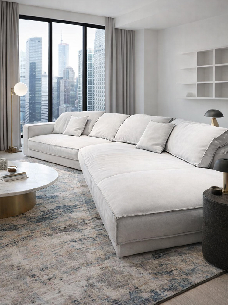 The Aurelio Luxury Leather Feather Sofa blends Italian-inspired minimalist design with exceptional seating comfort. Its deep seating and plush back cushions create a relaxed lounge experience while maintaining an elegant presence in the living space.